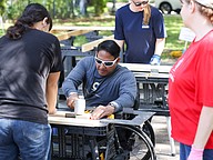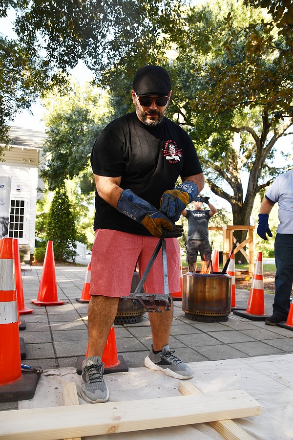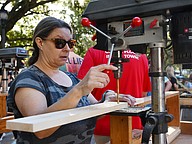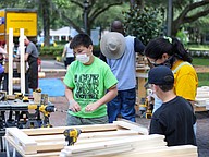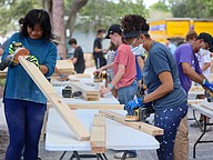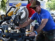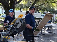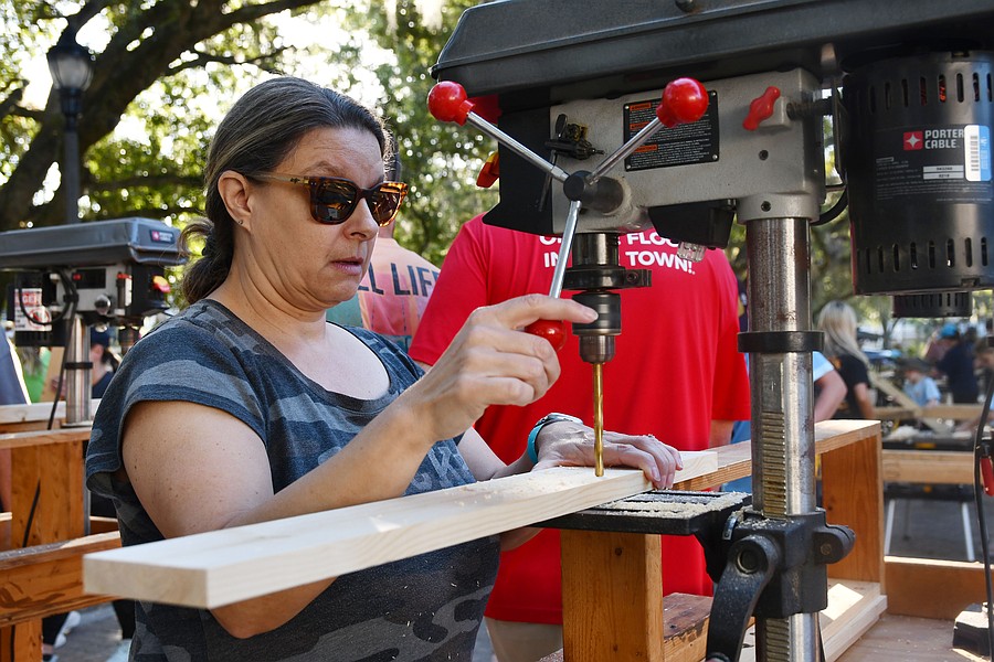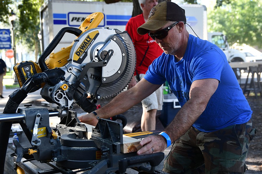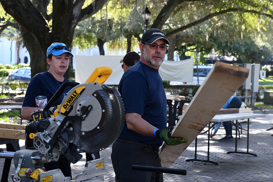 Within 10 minutes, a roar of buzzing began as dozens of volunteers started sawdusting while others were cutting or drilling wood, staining wood, branding the boards and more.