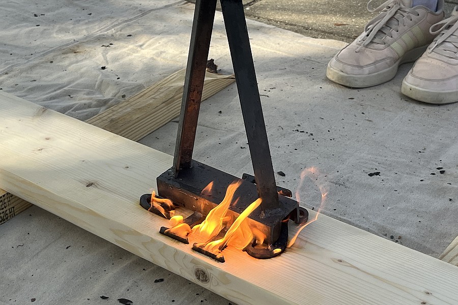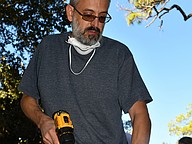 Chris Tarpein drilled holes into boards of wood before passing them onto the next phase of the build.