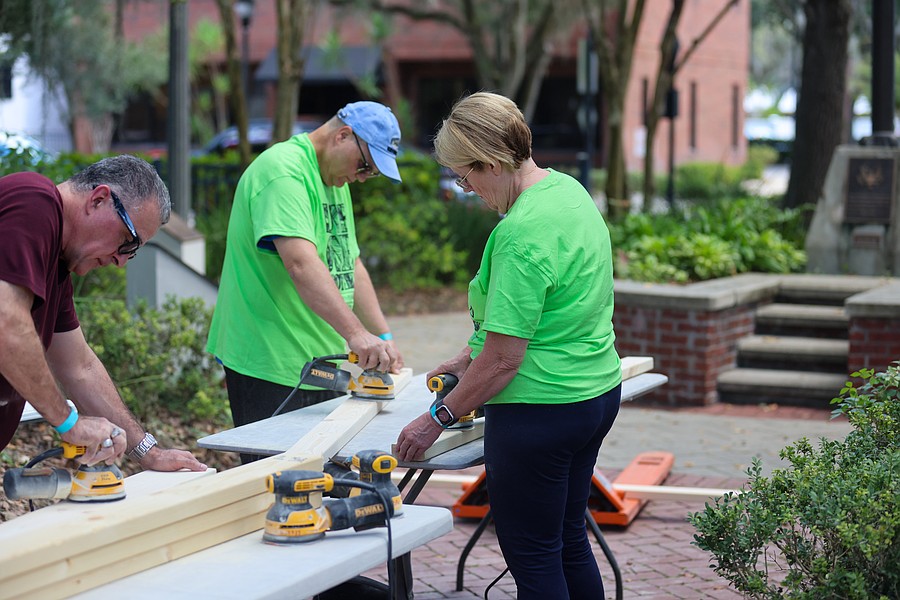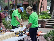 Pastor Brad of Windermere Union Church works alongside Winter Garden Stake President Gary Hansen of The Church of Jesus Christ of Latter-day Saints and his wife Melanie Hansen sanding boards