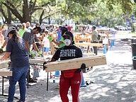 A volunteer from the Windermere Seventh-day Adventist Church carried boards.
