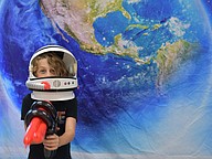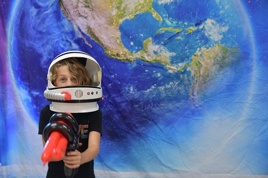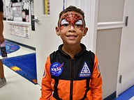 Logan Pereira dressed as an astronaut and smiled with his Spider-Man face paint.