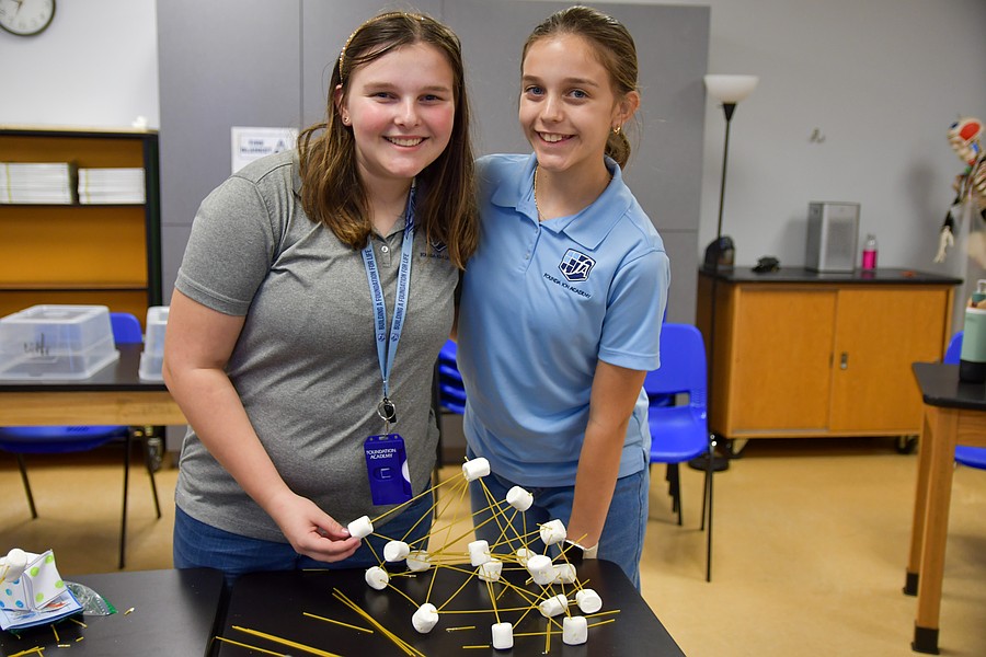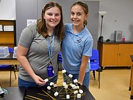 Ellie and Emmalynn Elliott worked together to make a bridge out of spaghetti noodles and marshmallows.