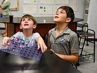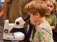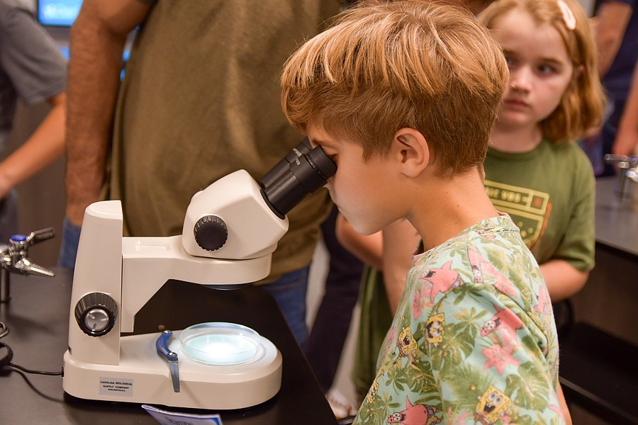 Kids were curious as they peeked through microscopes to see 4-day-old shrimp up close.