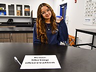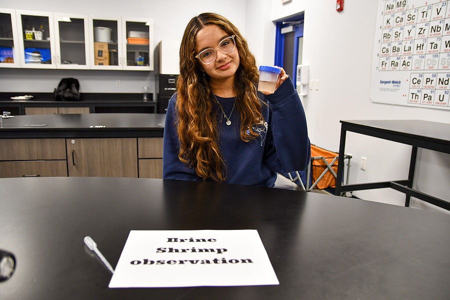 Senior Alexa Garcia held the container of brine shrimp Foundation’s students grew for Science Night.