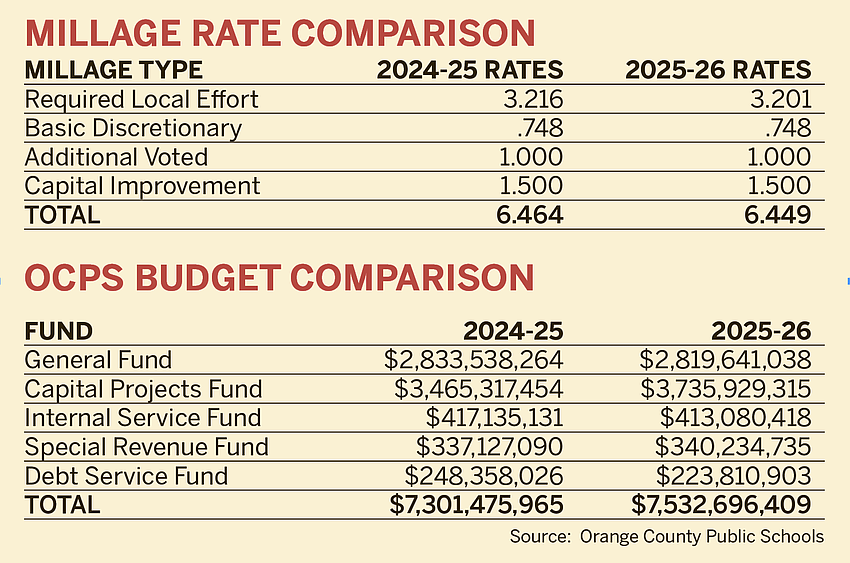 The School Board approved a .015 reduction in the 2025-26 millage rate — from 6.464 to 6.449. However, with a 2.95% consumer price index increase of assessed property values, homeowners will see an increase in their taxes. OCPS Chief Financial Officer Doreen Concolino said a homeowner with a value at $346,321 last year paid $2,077 in school taxes. This year, that same home is valued at $355,800, and the school tax will be $2,133.