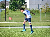 Marcello Muccilo hovered in the air momentarily after kicking the soccer ball.