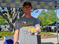 Thomas Zavaln took a break from walking to sit in the lawn and enjoy his Chick-fil-A nugget.