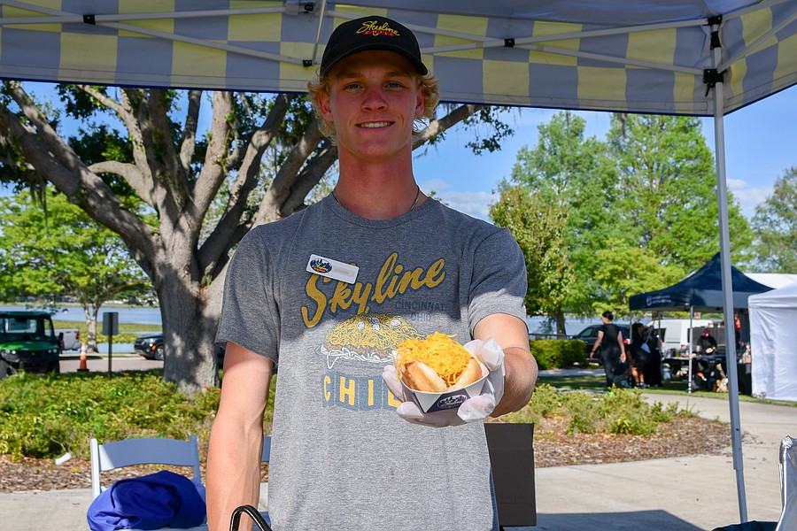 Skyline Chili’s Mason Strain carefully loaded each hot dog with the restaurant’s signature chili and cheese combination.