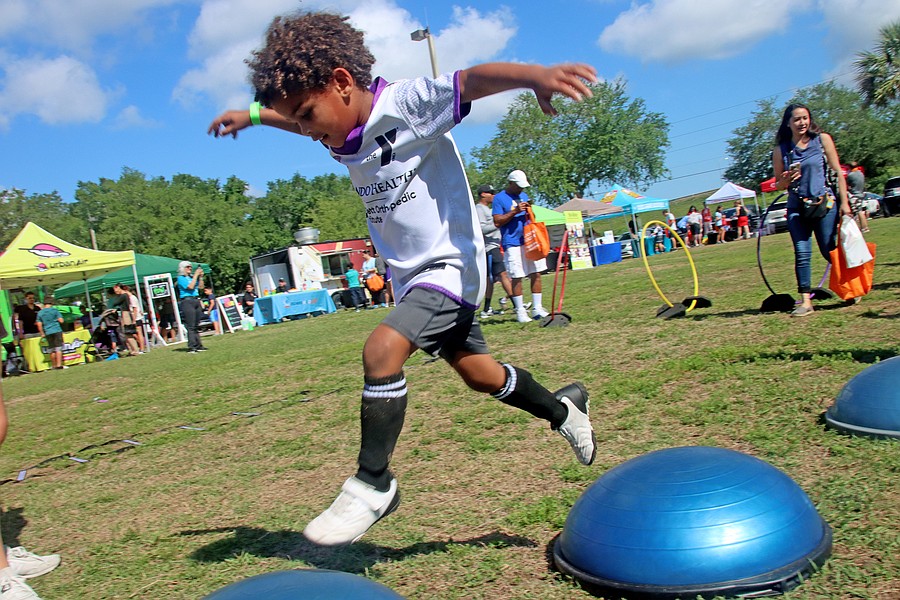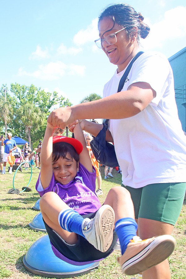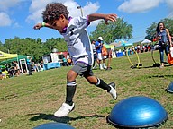 Micah Coe, 3, showed off his balancing skills at the Bosu ball obstacle course.
