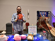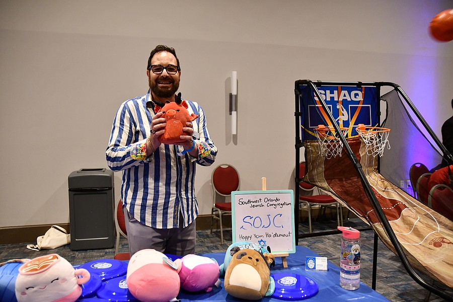 Rabbi Shai Specht-Sandler with the Southwest Orlando Jewish Congregation brought games and squishmallows to enjoy.