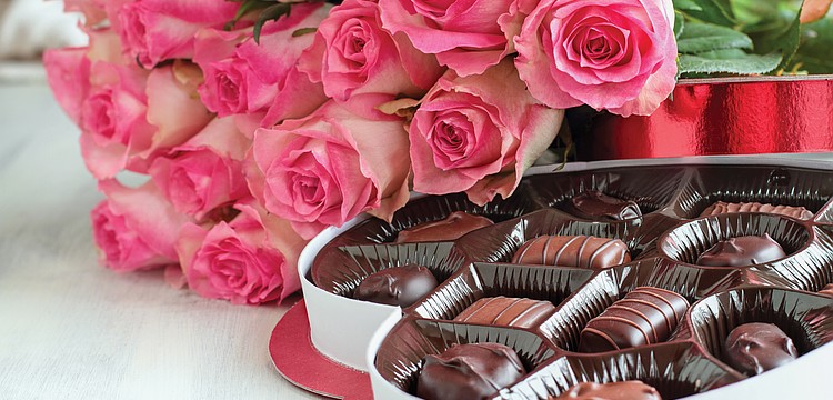 Dozen soft pink rose flowers with a heart shaped box of chocolate candy for Valentine Day over a wood background.