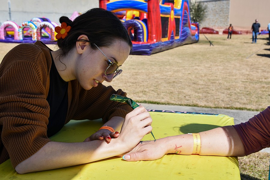 Kylie Bishop carefully hand drew henna on a guest’s arm. Bishop brought face paint and henna to the cookoff.