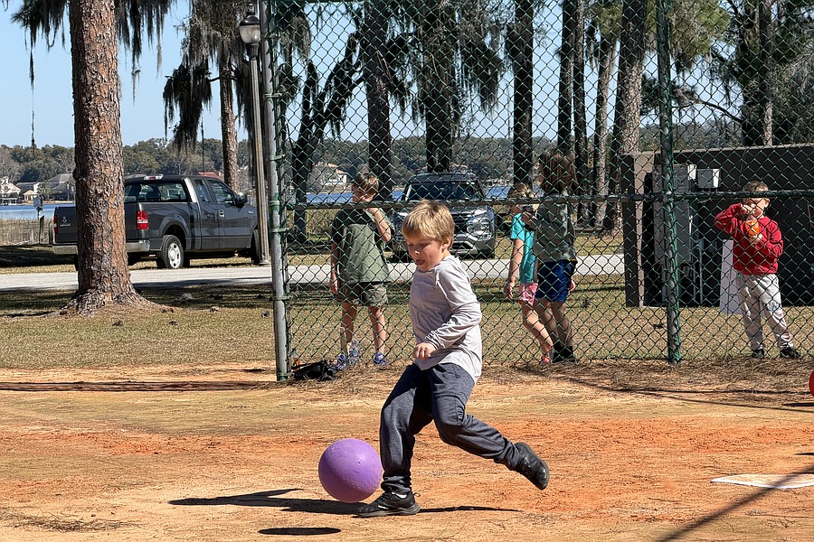 First-grader Wyatt Johnson kicked the ball as hard as he could in the kickball game against parents.