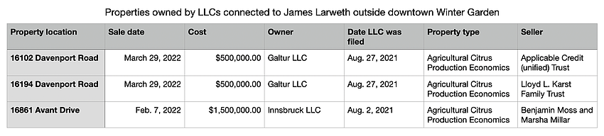Also in 2022, LLCs connected to Larweth purchased three properties — two of which are on Davenport Road and the other on Avant Drive in Winter Garden — used for agricultural citrus production economics for a combined total of $2.5 million, according to property records. In March 2022, he opened Anton Groves, which produces Navel and Valencia oranges.