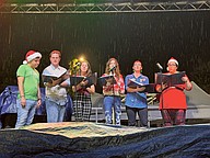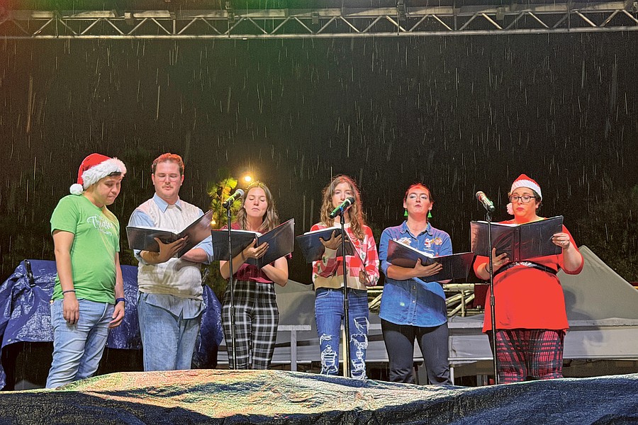 Horizon West Theater Company members sang ‘O Christmas Tree’ during a rainy Christmas at Hamlin event.