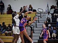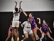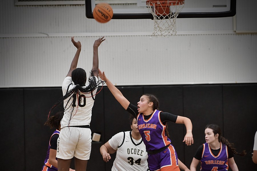 The Knights’ Gabriella Fortius jumped high to shoot above Horizon’s defense. Ocoee won the game 69-35.