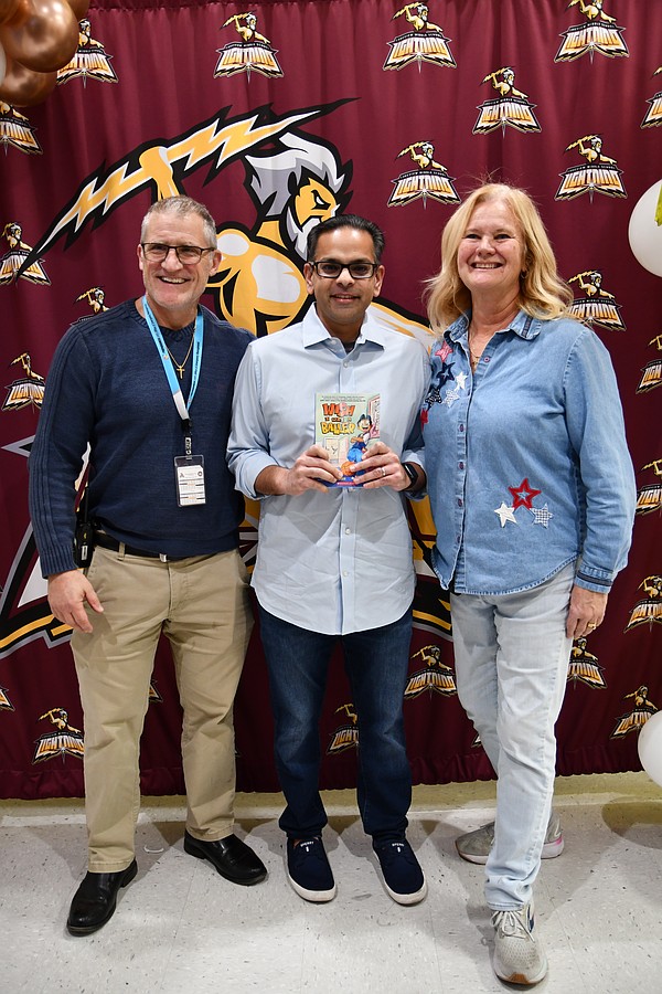 Principal John Linehan, left, and media specialist Patricia Rawlings, right, welcomed author Amar Shah to the ribbon cutting of Lakeview Middle’s renovated media center.