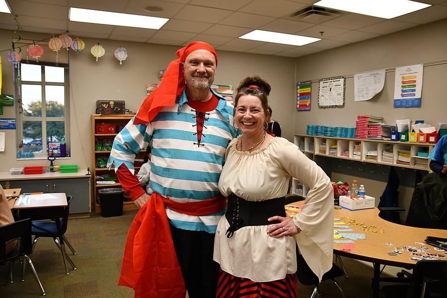 Christopher Nowik and Heather Bridgeman said they always dress up for Read, White & Blue Literacy Night. They had students write stories about how they became a pirate and gave them gold coins.