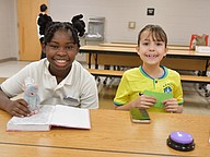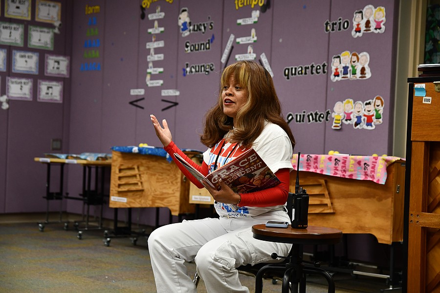 Dr. Trisha Travis, assistant principal, engaged the students by asking them what they would do if they ran for the school’s president. One said she would give everyone free ice cream and the other said she’d extend recess.