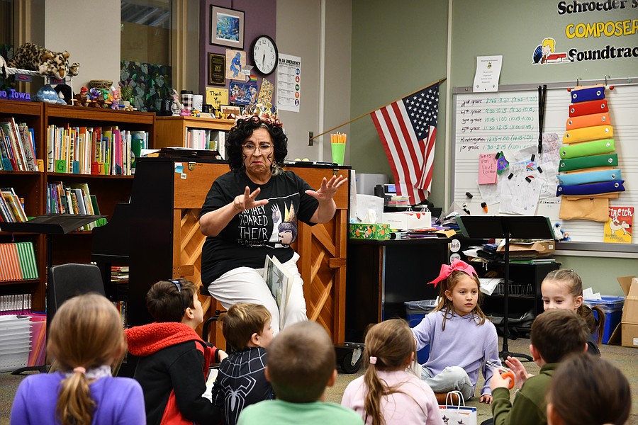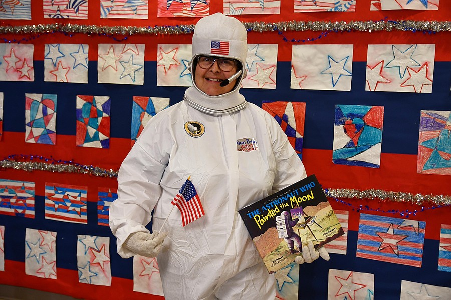 Whispering Oak Elementary’s art teacher Vivian Alfonso dressed as an astronaut and showcased her students’ work. She later read a book as a mystery reader.