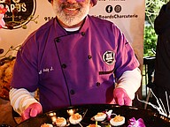 Chef Andy Rapharel with Big Boards Catering offered samples of bloody Mary deviled eggs with pepperoni garnish with saffron and bacon.