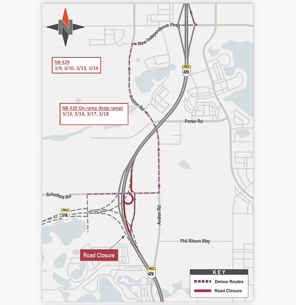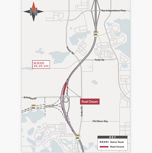 As a result, every night from 9 p.m. to 6 a.m. Sunday, March 8, through Saturday, March 14, northbound S.R. 429 from Schofield Road to New Independence Parkway is scheduled to close for road work. Drivers will take a detour at the exit at Schofield Road and travel north on Avalon Road to New Independence Parkway.