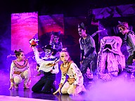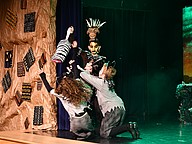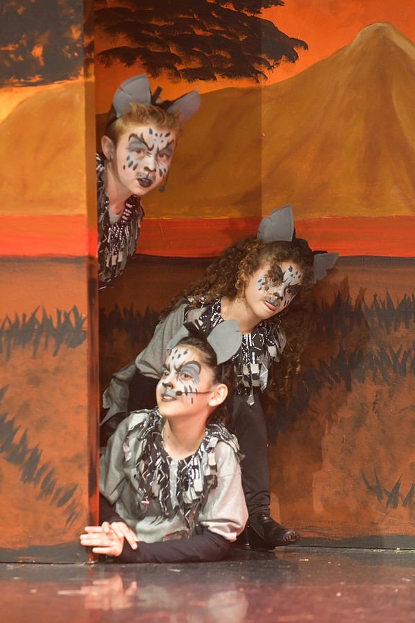 Young Nala, played by Ranya Laaroussi, Zazu, played by August Moore, and young Simba, played by Chandler Jordan, were caught by hyenas Ed, played by Maria Paula Graterol Riera, Banzai, played by Kavi Patel, and Shenzi, played by Dash Wojcik.