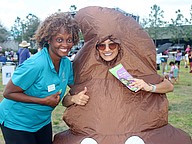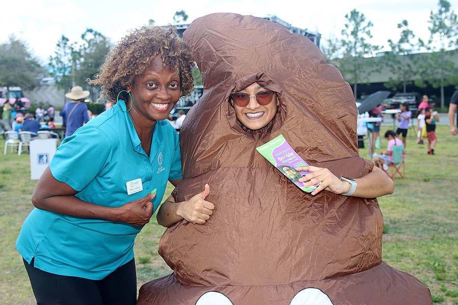 Dorcas Dillard, HUBB community resource specialist with Healthy West Orange, enjoyed meeting an appropriately dressed representative of Aunt Ann’s Dookie Disposal.