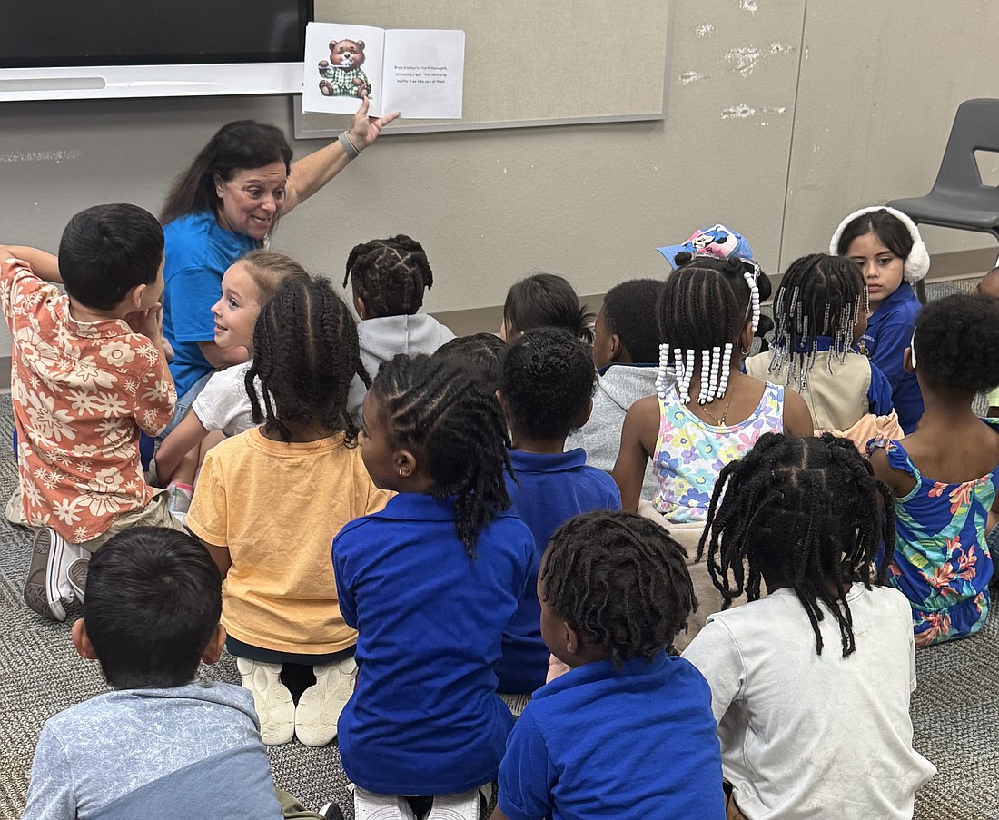 At the end of the visit, every student receives a reading care package that includes a teddy bear reading buddy, books they can keep, a reading passport to track reading at home and a hygiene kit.