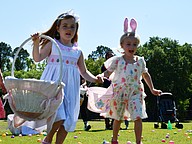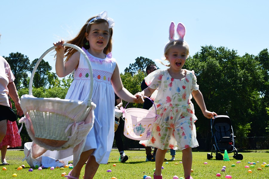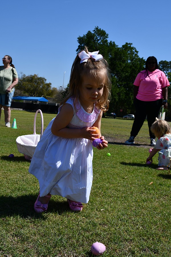 Evelyn Harris, who is 5, and 4-year-old Lily Matthews dashed around the soccer field to collect eggs.