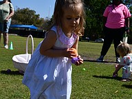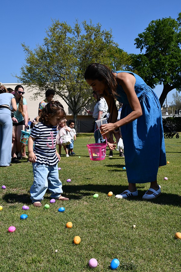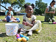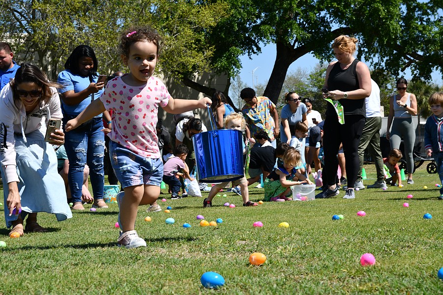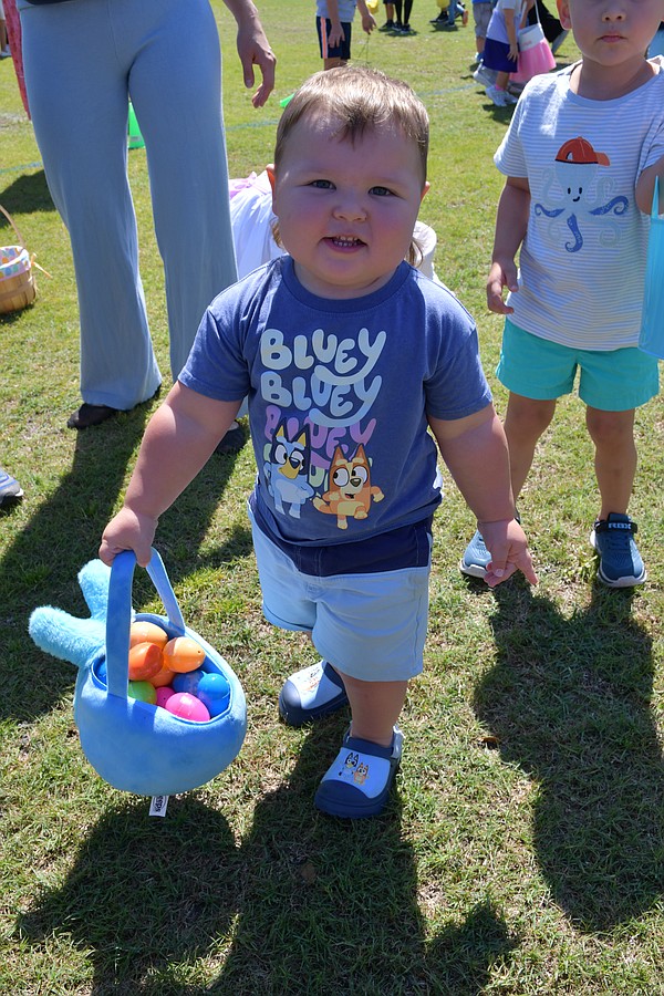Caroline Harris, who is 2, held as many eggs as she could before placing them in her basket and running off for more.