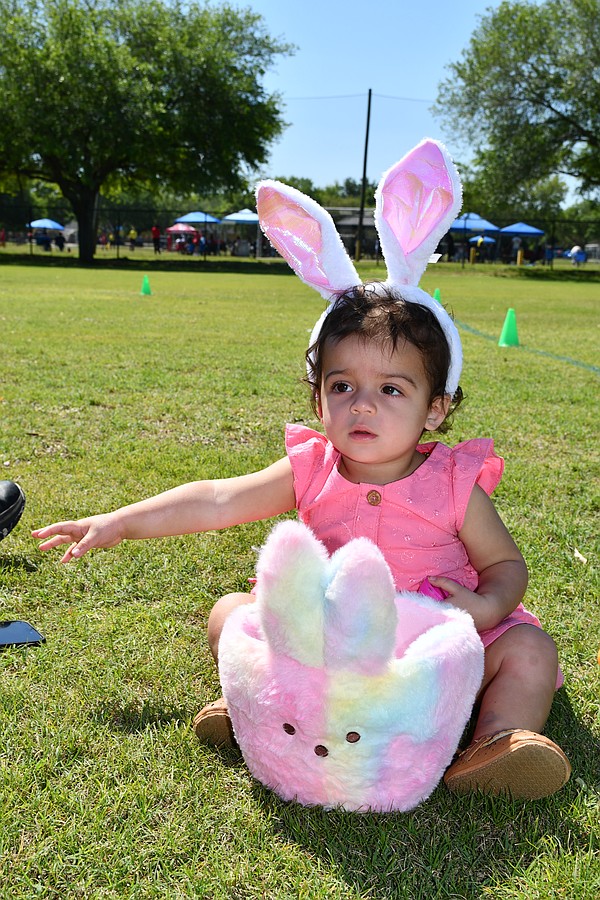 Alejandra Garcia, who is 1, participated in her first Easter egg hunt. She collected three eggs and wanted to sit and admire her collection.