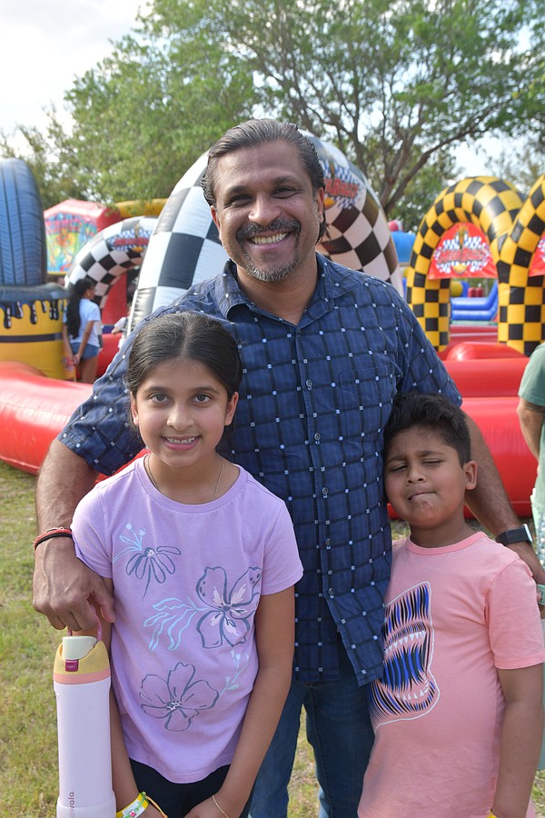 Kumar, Ella and Nathan Asnani waited in line to hop on a carnival ride.