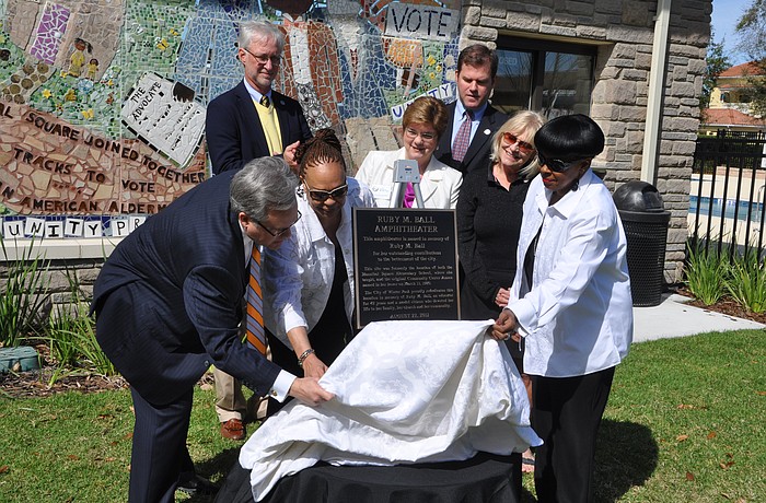 Winter Park city commissioners dedicated the amphitheater of the new Winter Park Community Center in honor of Ruby Ball on Monday. Ruby Mae Roberts Ball was a longtime Winter Park resident, mother of six, educator and humanitarian. The event included the unveiling of an engraved plaque honoring her many life accomplishments.
