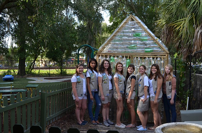 Constructed by Girl Scout Troop 827 of Winter Springs, Florida, in the new Generation Service Unit, as a gift to the Winter Park Day Nursery. The troop is comprised of girls from Winter Springs and Casselberry, many of whom have been with the same troop for 10 years. The greenhouse is constructed of 2-litre soda bottles and took nearly 100 hours to complete over the period of a year; it required sorting, cleaning and cutting the ends off of nearly 1,500 soda bottles that could be strung on a wooden frame. The greenhouse project is the troop’s final step to earn the Girl Scout Silver Award, the highest award at the Girl Scout Cadette level. Thanks to the new greenhouse, the two-to-five year olds at the day nursery can learn to grow their own flowers, vegetables and herbs. One of the challenges to Girl Scouts earning their Silver Award is to find a project with a lasting or on-going impact in their community. Troop 827 recognized that the greenhouse could solve both the shortage of healthy food in the community and the center’s need for an outdoor learning center. They also liked that it used recycled materials. Next up for Troop #827 will be a Silver Award ceremony at which they will receive their Silver Award pins and a party to celebrate their accomplishment.